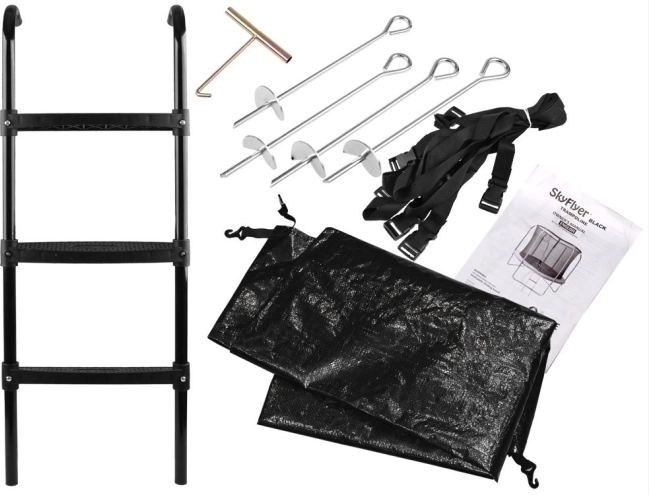 Échelle, filet de protection, corde de fixation du filet, ancres avec sangles, housse imperméable, protège-ressorts, crochet pour ressorts, notice de montage