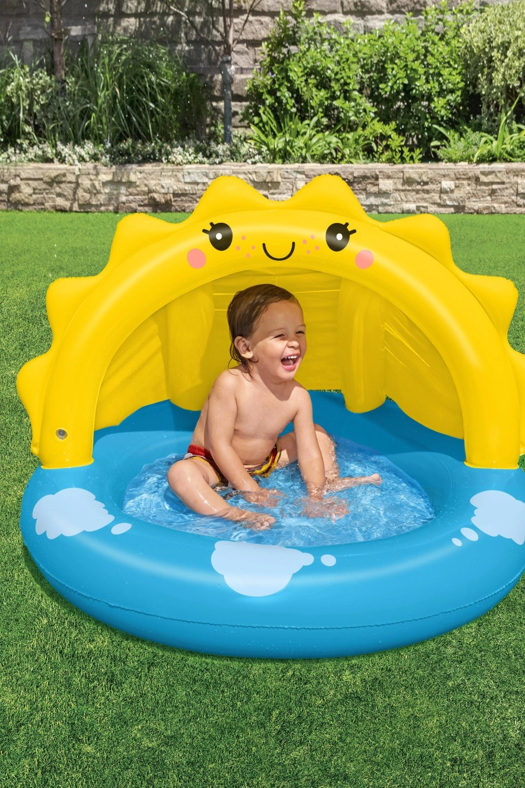 La piscine gonflable avec auvent SOLEIL est un excellent choix pour les premières jeux d’eau des enfants. Son design joyeux avec un soleil souriant et des nuages ravira les petits nageurs, tandis que l’auvent UV intégré procure une ombre agréable. Le fond doux et texturé augmente le confort d’assise et la sécurité pendant le jeu.