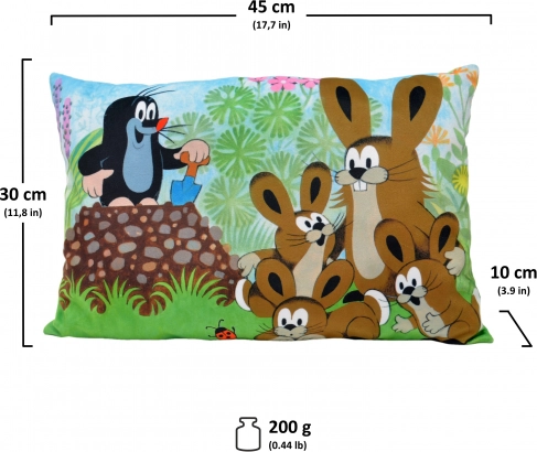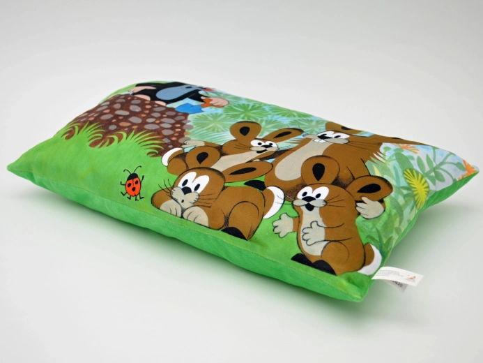 Un coussin tout doux avec le motif du célèbre Petite Taupe (Krtek) et des lapins, idéal pour le lit, les voyages ou comme décoration charmante dans la chambre d’enfant.
