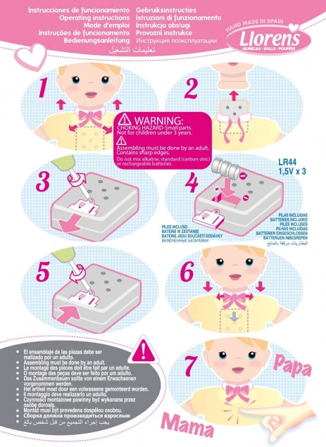 Le produit est fabriqué à la main en Espagne et est présenté dans une belle boîte cadeau. Il est recommandé pour les enfants à partir de 3 ans et sa taille est entièrement compatible avec d'autres vêtements de la marque Llorens. La poupée comprend également 3 piles bouton LR44 facilement remplaçables selon le manuel inclus.