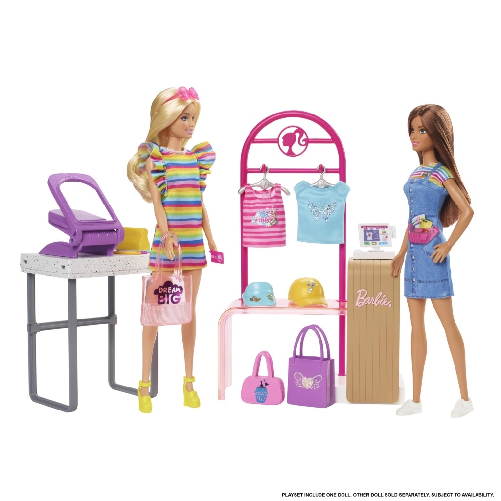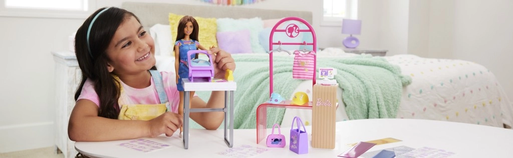 Le set de jeu Barbie Studio de design de mode avec poupée permet aux enfants d’ouvrir leur propre boutique de vêtements et propose trois modes de jeu : conception de tenues, fabrication et vente. Les petits stylistes peuvent créer des tenues uniques grâce à la fonction de sérigraphie sur film et les décorer avec des autocollants réutilisables pour plus de 150 looks différents. Le portant avec cintres est idéal pour suspendre les créations, les exposer et les emballer pour la vente. La poupée ne tient pas debout seule. À partir de 5 ans.