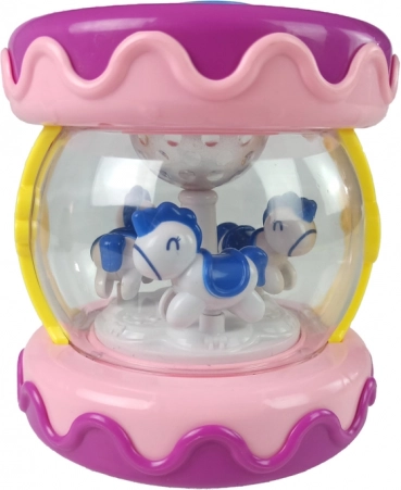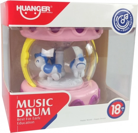 Le tambour est équipé d’un carrousel avec des petits chevaux à l’intérieur, offrant une expérience visuelle interactive pour les enfants.
