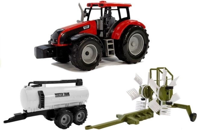 Tracteur avec remorque, andaineur et citerne – rouge