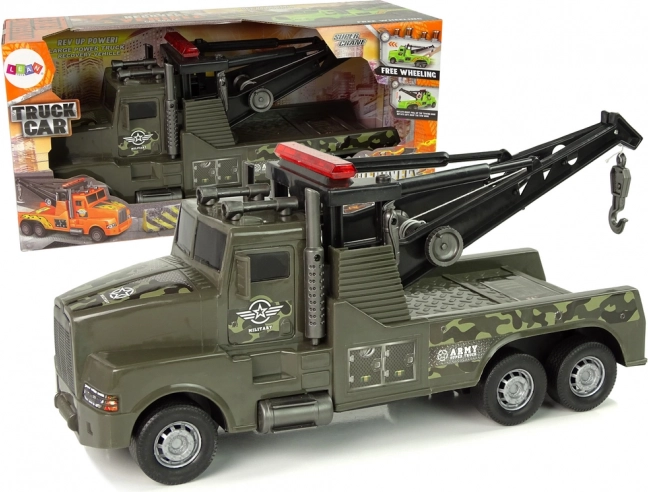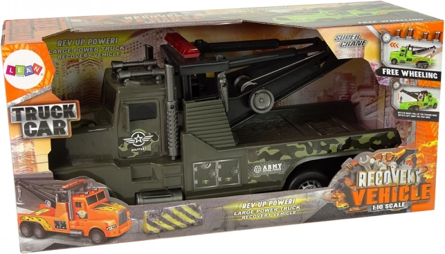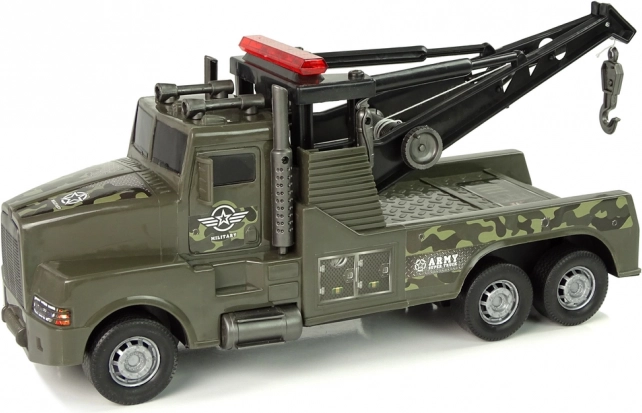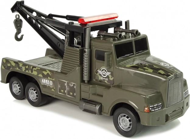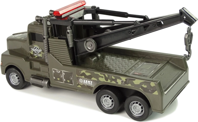 Cette dépanneuse en plastique avec imprimé camouflage et autocollants militaires ravira tous les enfants qui aiment les missions d’action et de secours. À l’arrière se trouve une grue avec treuil qui s’étend grâce à une manivelle latérale, terminée par un crochet solide pour fixer facilement un autre jouet.