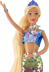 La poupée porte un collier élégant, des bracelets et une couronne, ce qui en fait la reine du monde marin.