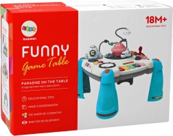 Sur la table, il y a un module avec piano qui apprend aux enfants l'alphabet et les chiffres en anglais. Cela garantit des expériences à la fois amusantes et éducatives. De l'autre côté de la table, ils trouveront différents jouets sensoriels parfaits pour le développement de la motricité fine et de la perception sensorielle.
