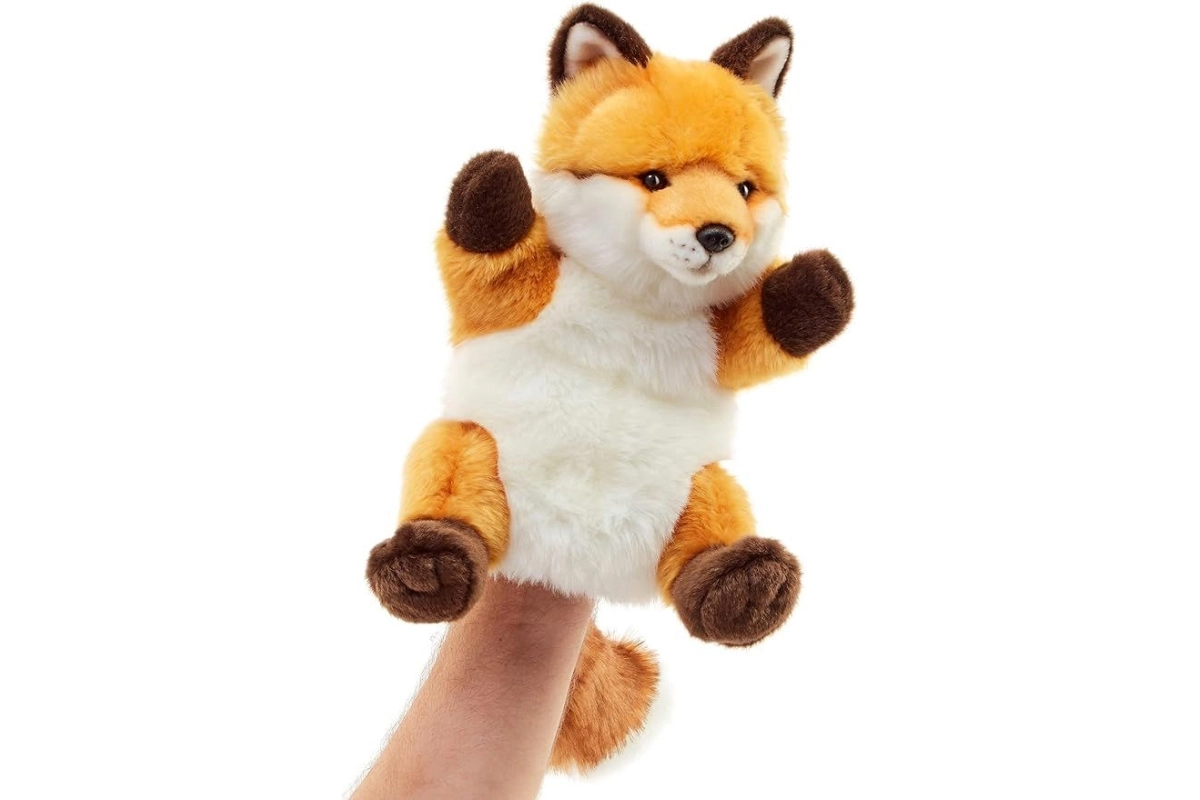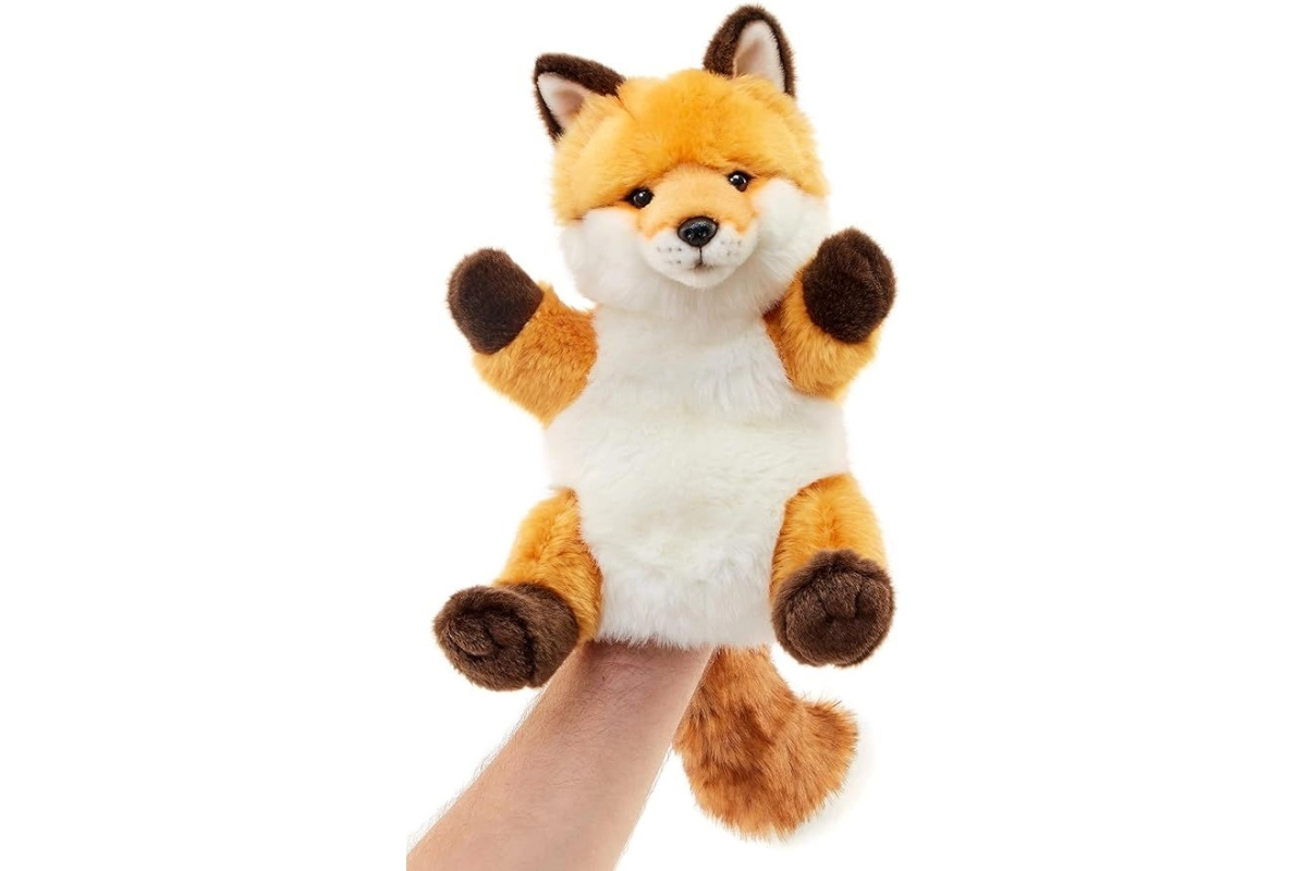 Marionnette renard en peluche. Dimensions 14 x 38 x 18 cm (mesurées queue comprise). Âge 0+