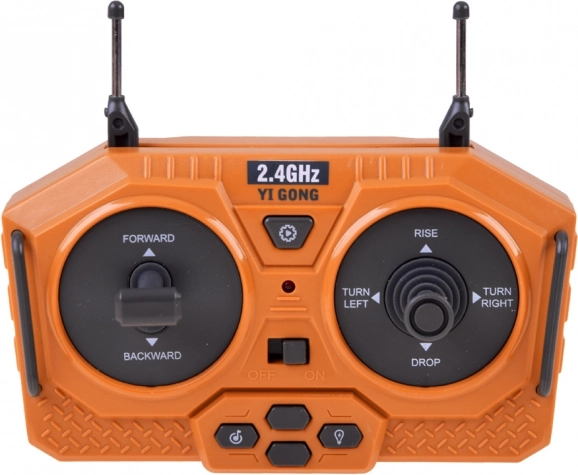 La machine est équipée de lumières et de sons : bruit de moteur en roulant, alarme intermittente lors des virages et bruit mécanique caractéristique lors du levage/de l’abaissement de la lame. Le contrôle en 2,4 GHz est stable, avec marche avant/arrière, virage et commande électrique de la lame (le crochet arrière se règle manuellement). L’alimentation est assurée par la batterie 3,7 V 500 mAh fournie, avec recharge via USB.