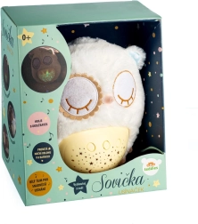 Le petit hibou projette un ciel nocturne en 8 teintes colorées qui créent une atmosphère propice à l’endormissement et apaisent les sens de bébé.