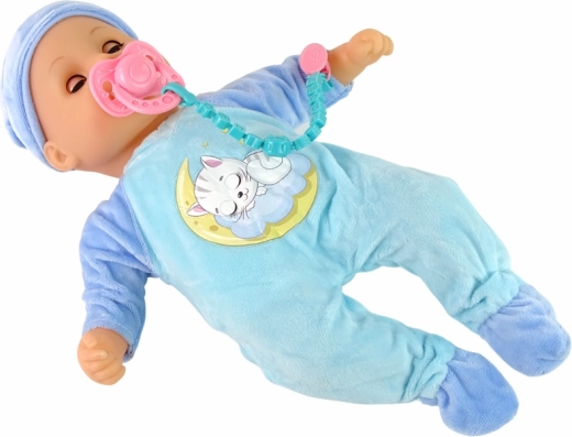 L’adorable poupée bébé est habillée d’un joli pyjama bleu avec un motif de chat endormi et porte un bonnet. Le set comprend également une tétine rose et un biberon. Les accessoires incluent aussi un bavoir et une culotte. L’ensemble est harmonieux et très charmant.