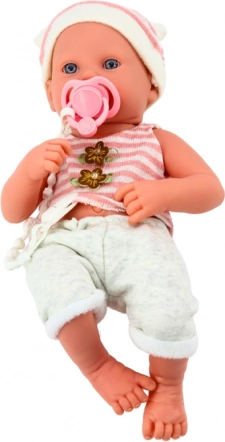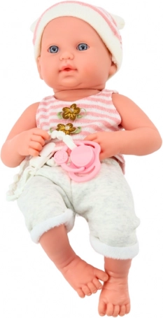 Adorable poupée bébé en tenue blanc‑rose avec bonnet, idéale pour les jeux d’imitation et de soin. Elle possède des traits du visage réalistes, des bras et jambes articulés, ainsi qu’une tétine avec cordon et une couverture douce. Finition de qualité et sûre, recommandée dès 18 mois.