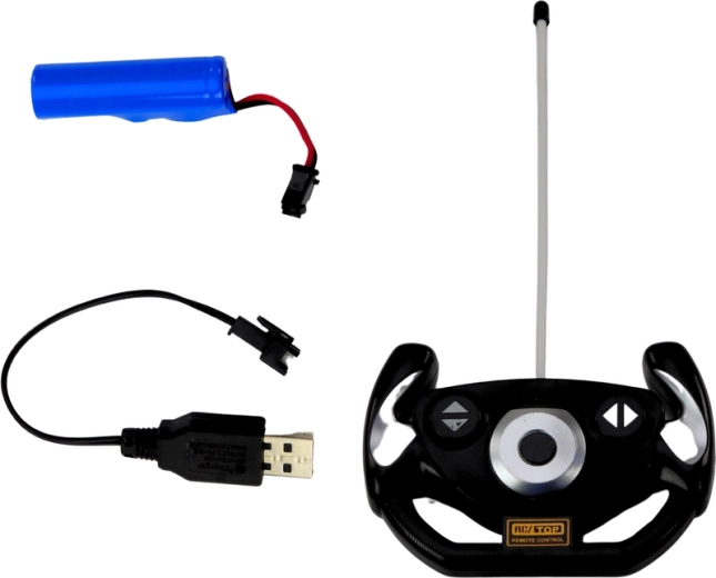 La télécommande en forme de volant avec des boutons et une antenne en métal pour une meilleure maniabilité du jouet.