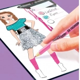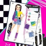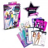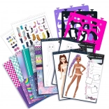L'ensemble comprend des gabarits en papier, des feuilles de motifs colorés et des pochoirs en plastique qui favorisent la créativité et permettent de concevoir des vêtements.