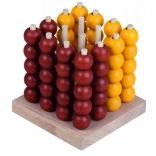 Le jeu Morpion 3D est équipé de 64 billes en bois de deux couleurs et d'un plateau de jeu avec 16 tiges. Les joueurs s'efforcent tour à tour d'enfiler les billes de leur couleur sur les tiges afin de créer une rangée de quatre billes dans n'importe quelle direction.