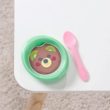 - Poupée habillée et accessoires sélectionnés : tétine, couche, biberon, cuillère, bol, assiette magique, pot (autres accessoires selon l’emballage)
