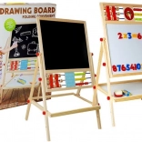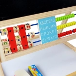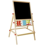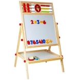 Le tableau est un accessoire indispensable : la petite artiste développera ses compétences artistiques en dessinant à la craie et pourra aussi apprendre à écrire et à compter. Il est équipé d’une étagère pratique pour les accessoires. Fabriqué de manière robuste avec des matériaux de la plus haute qualité. Finition soignée, sans bords tranchants. Pour dessiner sur le côté noir du tableau, utilisez des craies – trois couleurs sont incluses dans l’emballage. Il dispose d’un boulier avec des billes de 3 couleurs, grâce auquel l’enfant commencera l’aventure du calcul, et de l’autre côté, de cubes en bois avec des chiffres pour effectuer facilement des opérations mathématiques de base. Avec les chiffres et les signes mathématiques magnétiques, il peut apprendre les opérations de base comme l’addition, la soustraction et la multiplication. Au centre se trouvent des horloges sur lesquelles le tout-petit règle l’heure avec les aiguilles et apprend à la reconnaître.