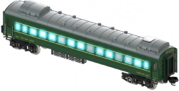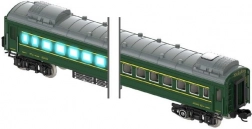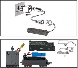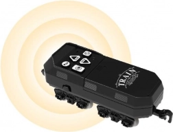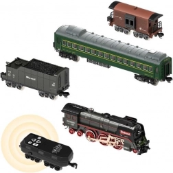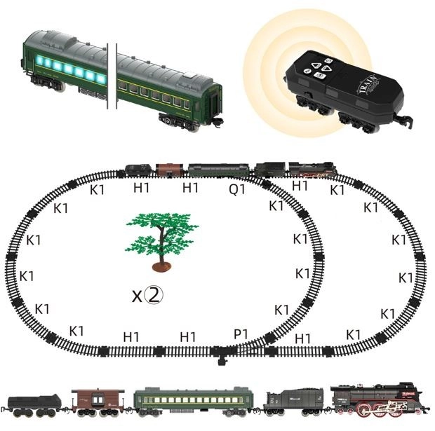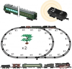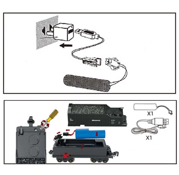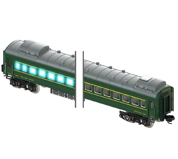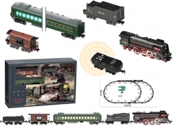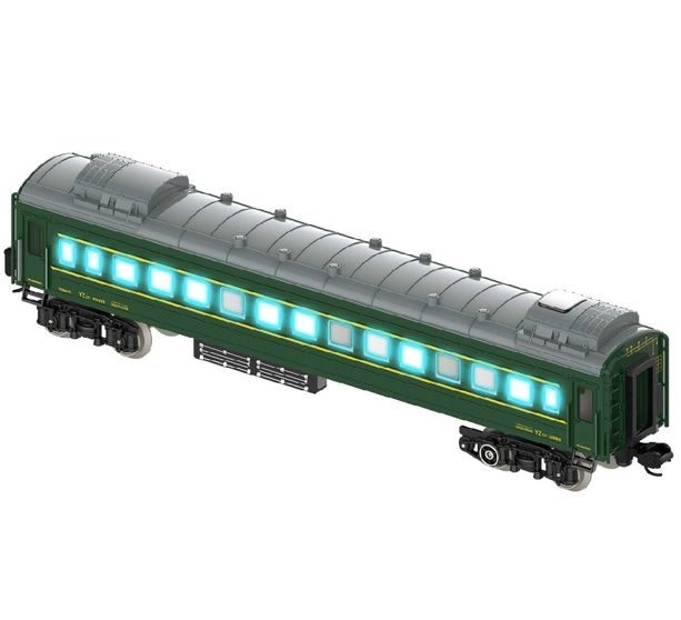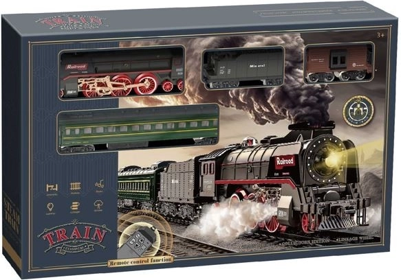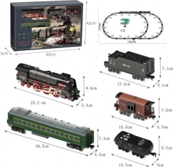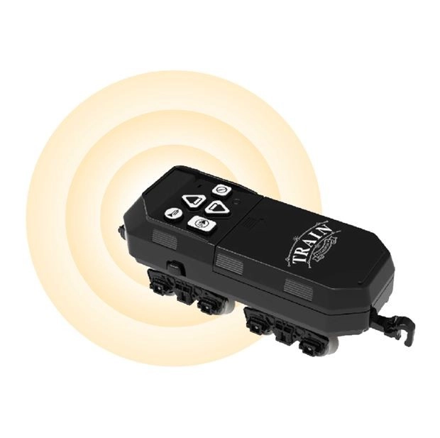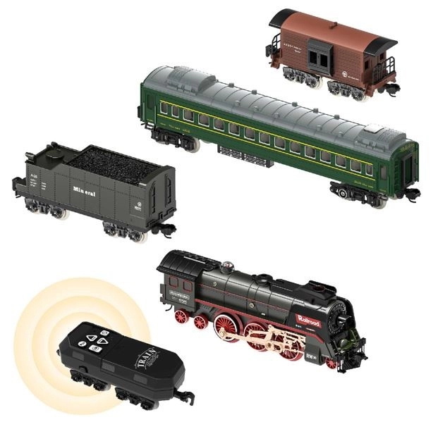 Locomotive + 4 wagons, lumière, piste sonore. Dimensions de la boîte à fenêtre : 65×7,5×42 cm. Chargement via USB. Wagon éclairé pour les passagers. Fonction fumée dans la locomotive.