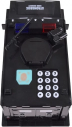 Il suffit d’approcher les billets de la fente – le mécanisme les entraîne automatiquement à l’intérieur. Les pièces se déposent par l’ouverture supérieure dissimulée sous le clapet du toit.
