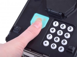 Saisissez un mot de passe à 4 chiffres (par défaut 0000) et confirmez-le en touchant le scanner d’empreinte digitale (simulation). La porte du coffre s’ouvre automatiquement après une procédure correcte.