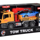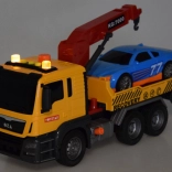 L'ensemble comprend également une voiture bleue de sport, qui s'adapte parfaitement à la dépanneuse. Le jouet entier est réalisé avec des couleurs réalistes - jaune, gris, rouge et bleu.