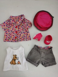 Un t-shirt avec un petit chien, une veste, un bonnet, un short et des petites chaussures créent un look harmonieux, combinable à volonté.