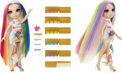 La poupée a des cheveux exceptionnellement longs et lisses avec des mèches arc‑en‑ciel, faciles à coiffer, tresser et modeler en différents styles – des ondulations aux tresses, jusqu’à des lignes de couleur audacieuses.