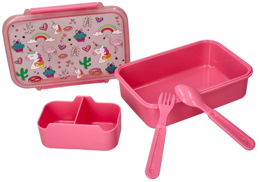 Des motifs colorés de licornes, d’arcs-en-ciel et de petits cœurs encouragent la joie des enfants à l’heure du goûter et font de la boîte un accessoire favori pour l’école.