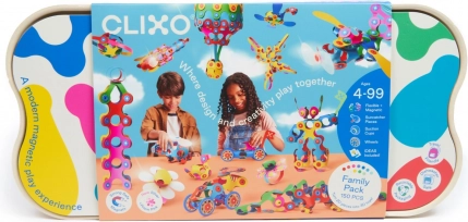 CLIXO Family Party est un grand set pour toute la famille et le jeu en groupe. Grâce à son système magnétique breveté avec rotation à 360° et verrouillage en 24 positions, vos créations restent fermes et stables. À partir de pièces flexibles et multidirectionnelles, construisez facilement des modèles 2D et 3D – des animaux et véhicules à l’architecture et aux projets scientifiques.