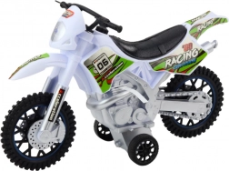 Ce modèle de motocross est fabriqué en plastique robuste qui résiste au jeu intensif. Son design blanc et vert avec des autocollants de course est très attrayant. Les grandes roues tout-terrain assurent la stabilité et une meilleure simulation de conduite sur surface irrégulière.