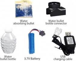 - Blaster, réservoir, lunettes de protection, batterie, câble USB