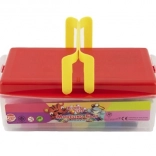 Boîte en plastique avec couvercle rouge et poignée jaune pour un transport facile et un stockage des pâtes à modeler, emporte-pièces et rouleau.