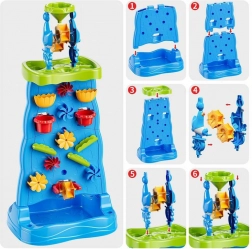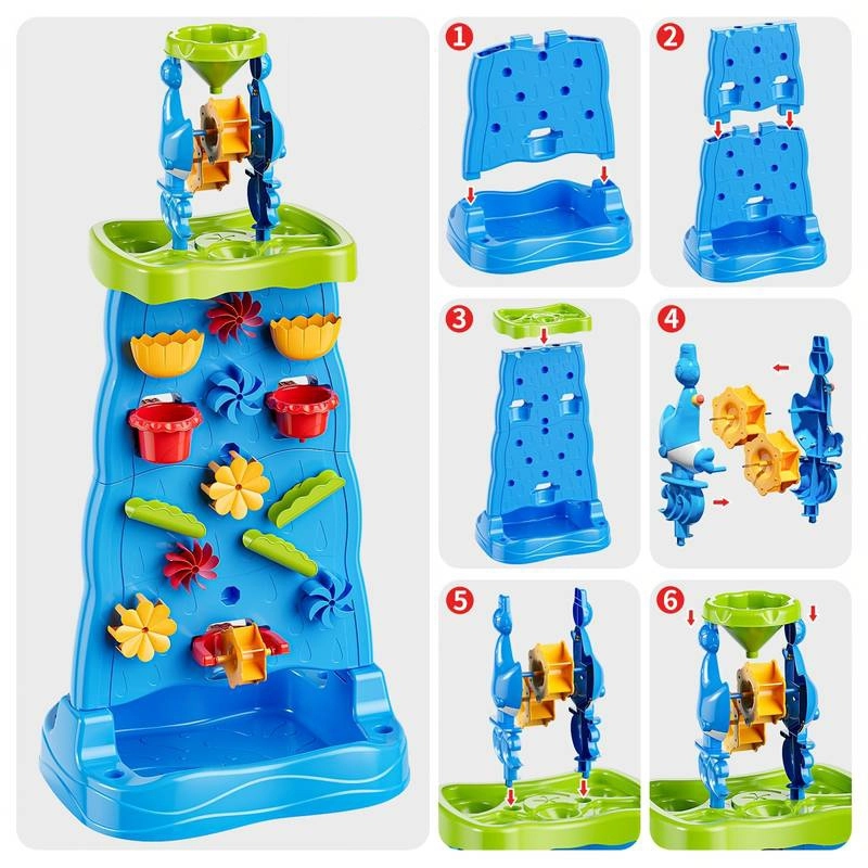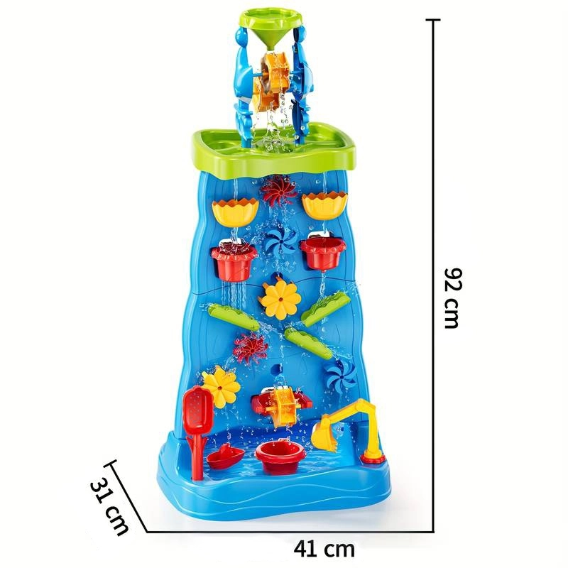 La large base et le mur accessible des deux côtés permettent un jeu partagé. Les enfants peuvent verser l’eau simultanément, observer les cascades et les roues en mouvement – idéal pour le partage et la coopération.