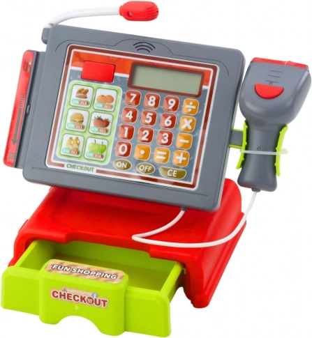 Caisse enregistreuse pour enfants avec lumières et sons, scanner, microphone et panier. Apprend à compter et développe la communication. Plastique de qualité, coloris rouge.