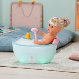 Emmenez la poupée dans la baignoire. Son corps rigide supporte les jeux d’eau et facilite le nettoyage après le jeu.