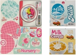 Cosmétique jouet, porte-savon, récipient à poudre, savons liquides, couverts jouets pour bébé, « lait » en boîte, « céréales » en boîte, set d’autocollants