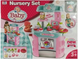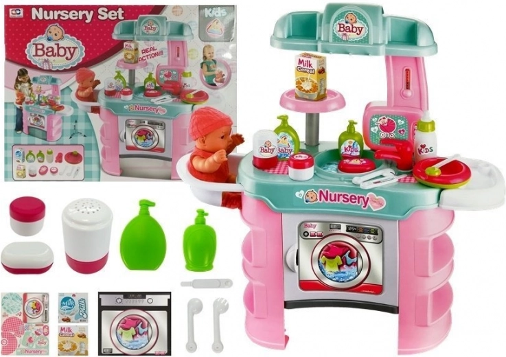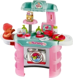 Offrez aux enfants un jeu de rôle réaliste de parents avec un set de soin pour bébé. Il comprend une table avec machine à laver, un lavabo avec robinet, un siège pour poupée et des étagères pratiques. Des accessoires riches comme de la cosmétique pour bébé, des couverts jouets et des aliments en boîte stimulent l’imagination et le développement des compétences.