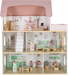 La structure résistante en panneaux MDF, les bords lisses et la fabrication stable assurent un jeu en toute sécurité. La maison mesure 70 cm de haut, idéale pour jouer à plusieurs frères et sœurs. Une armoire ouvrante, des accessoires mobiles et deux figurines en bois favorisent des histoires imaginatives et le développement de la motricité fine.