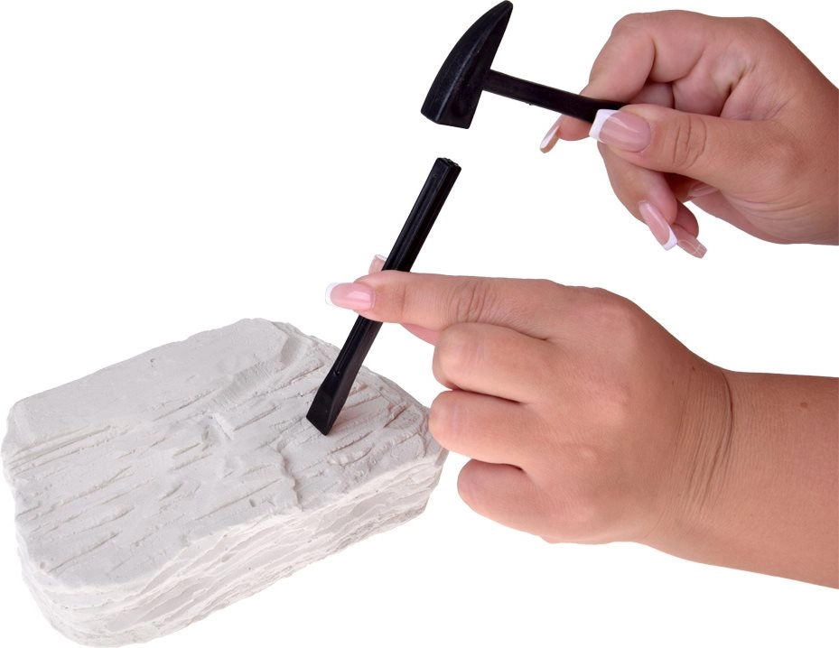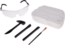 Bloc de plâtre avec crâne caché (surprise), 2× ciseau à pierre, 1× marteau, 1× brosse, 1× lunettes de protection