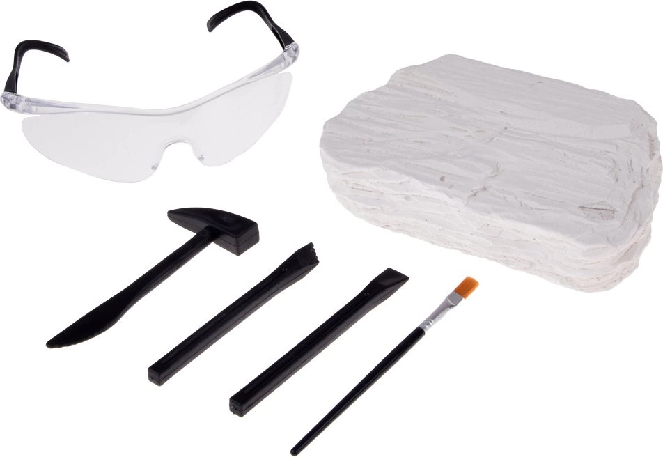 Le set comprend un bloc de plâtre robuste et des lunettes de protection qui protègent les yeux lors de la mise au jour de la fossilisation. Idéal pour une archéologie domestique en toute sécurité.