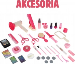 - Valisette avec poignée, 2 barrettes, 4 bigoudis, éponge à poudre, pulvérisateur/brume, 7 pinceaux de maquillage, 2 vernis à ongles, « mascara », « parfum », fards à paupières, « poudre », fer à boucler, lisseur, support pour lisseur, peigne, brosse, miroir, sèche-cheveux avec embouts interchangeables (diffuseur et embout plat), terminal de paiement, set de billets et pièces jouets, carte de client fidèle, carte de paiement, emballages en carton de cosmétiques (shampoing, après-shampoing, gel), pancarte en carton « Beauty Salon », 2 paires de ciseaux, « rouge à lèvres »
