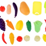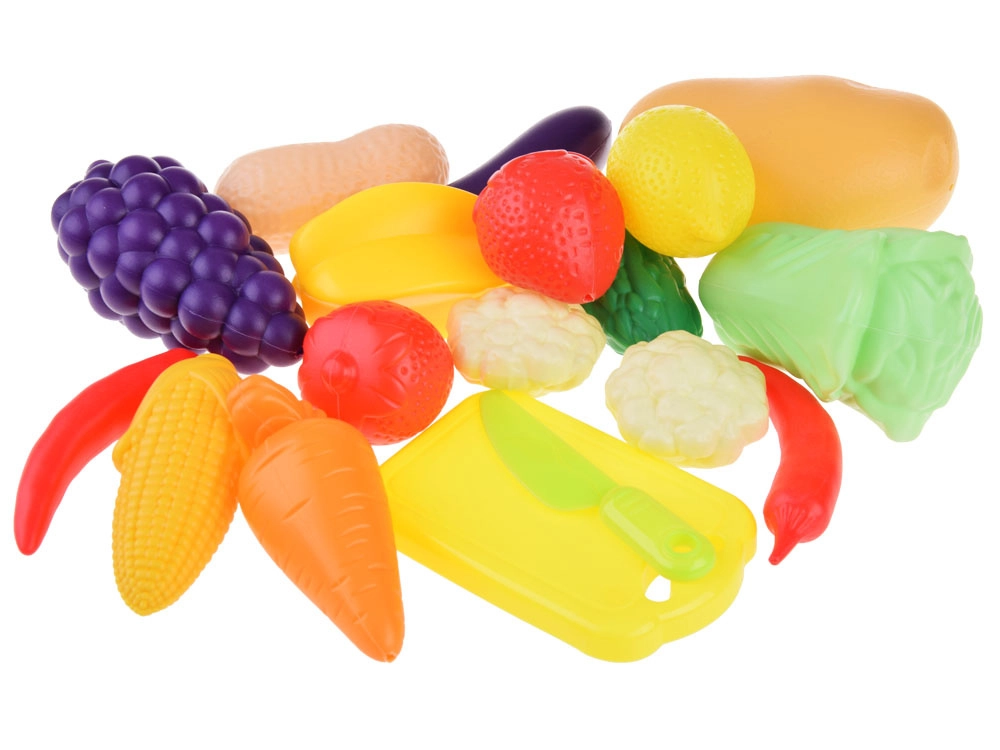 - Ensemble d’accessoires riche – différents fruits et légumes, planche à découper et petit couteau pour imiter la préparation des repas.