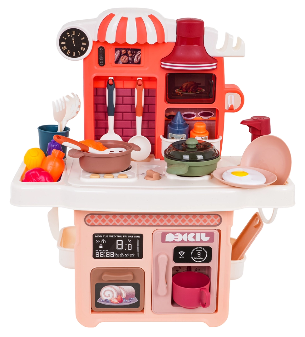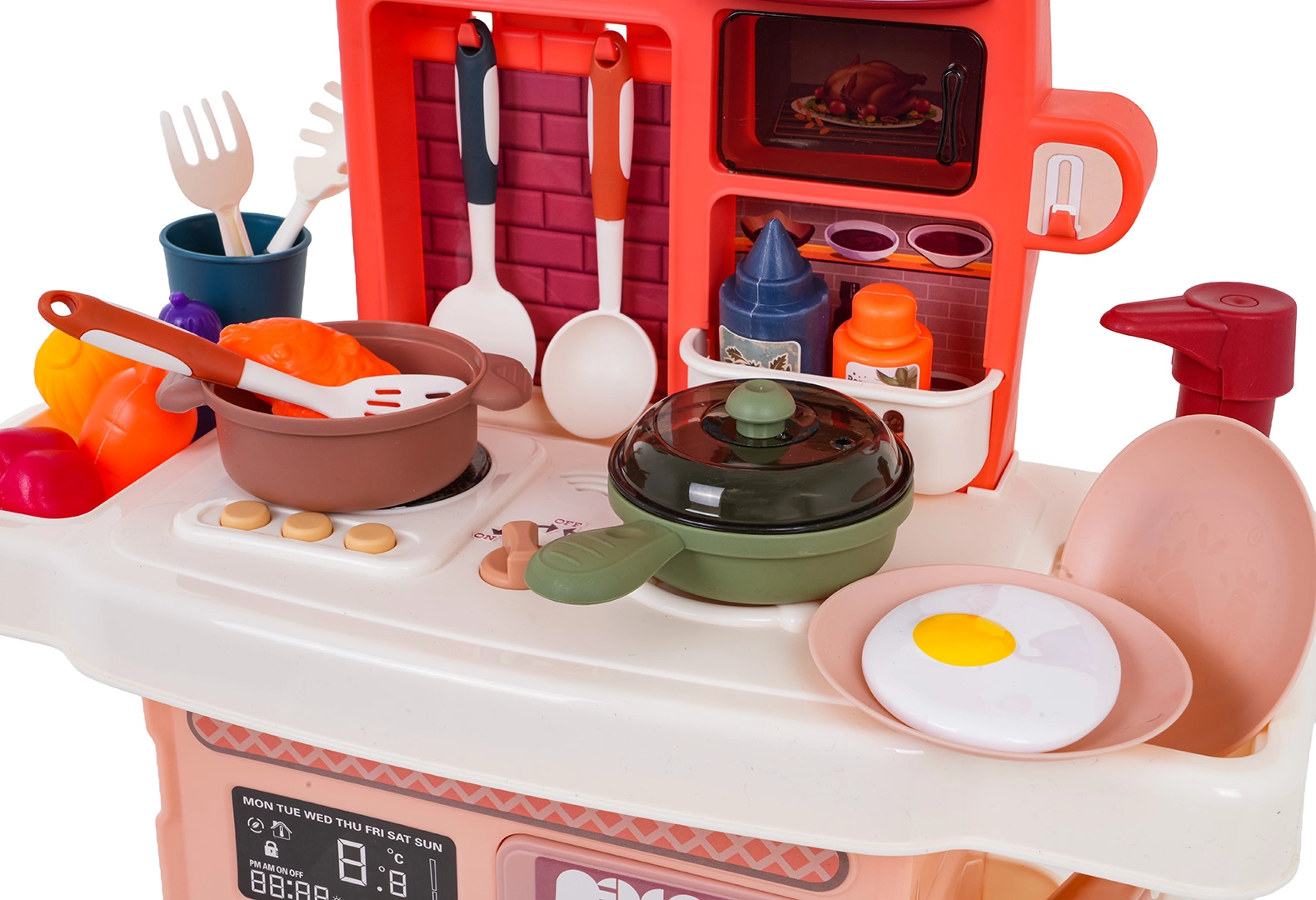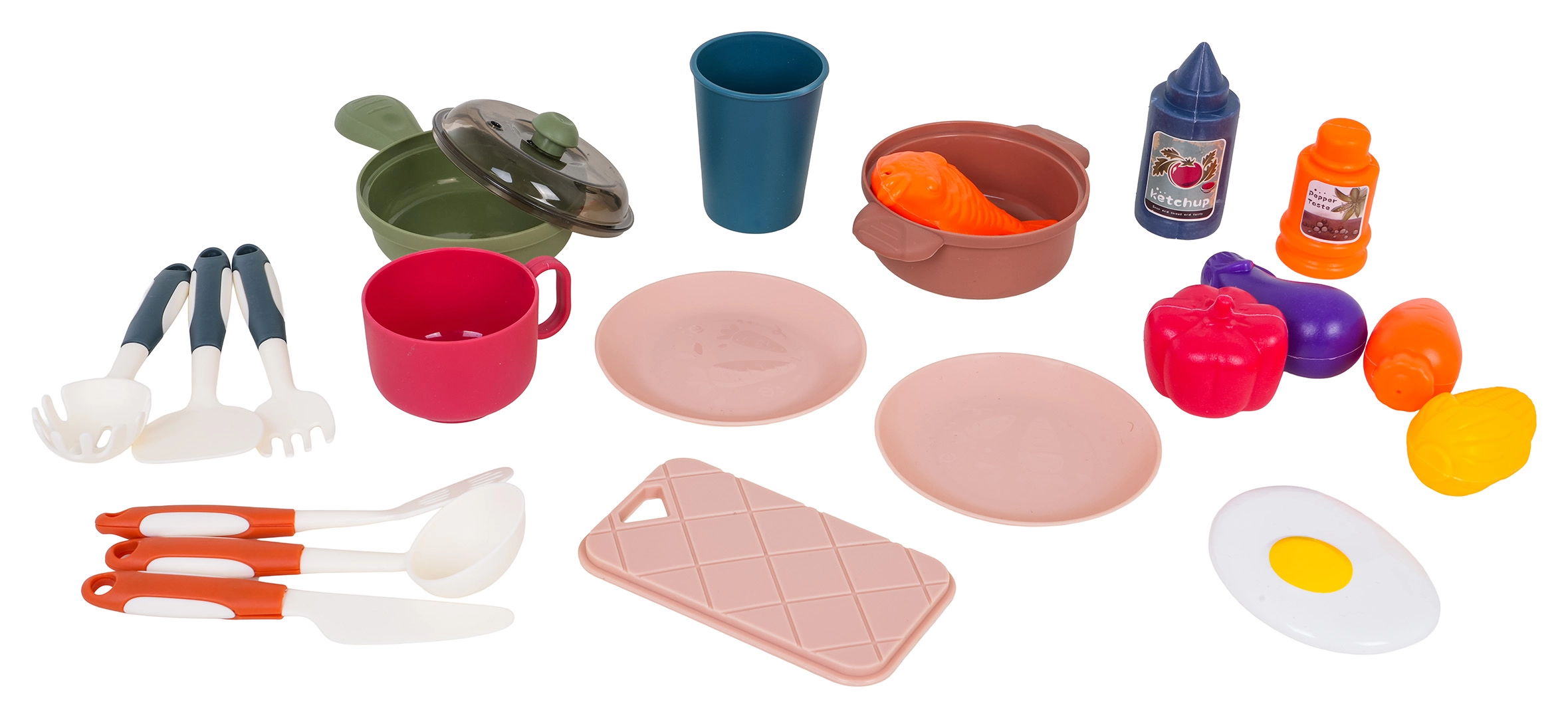 L’attraction principale est le robinet fonctionnel – une pompe à piles fait couler l’eau dans l’évier, permettant aux enfants de “laver la vaisselle” comme dans une vraie cuisine. Sont également inclus un four ouvrant, une imitation de machine à café et une hotte aspirante éclairée. Le riche assortiment d’accessoires (casseroles, poêle, ustensiles, assiettes et aliments) élargit les possibilités de jeu.