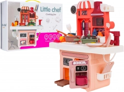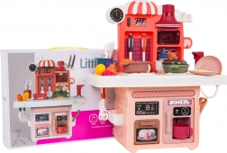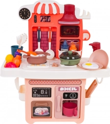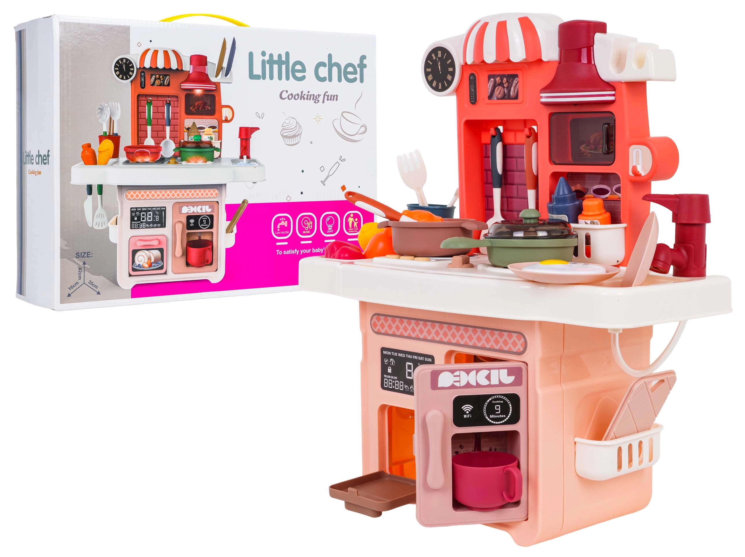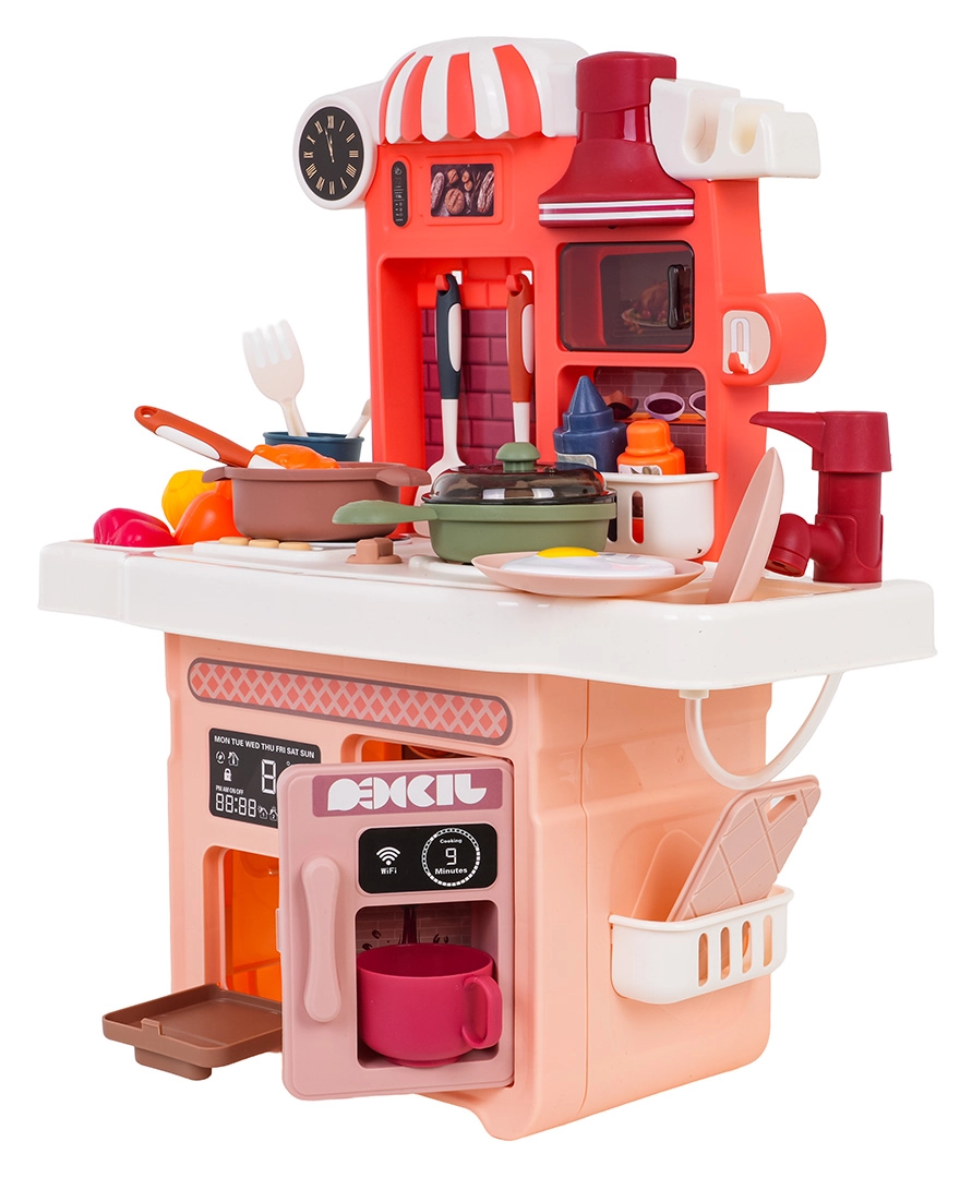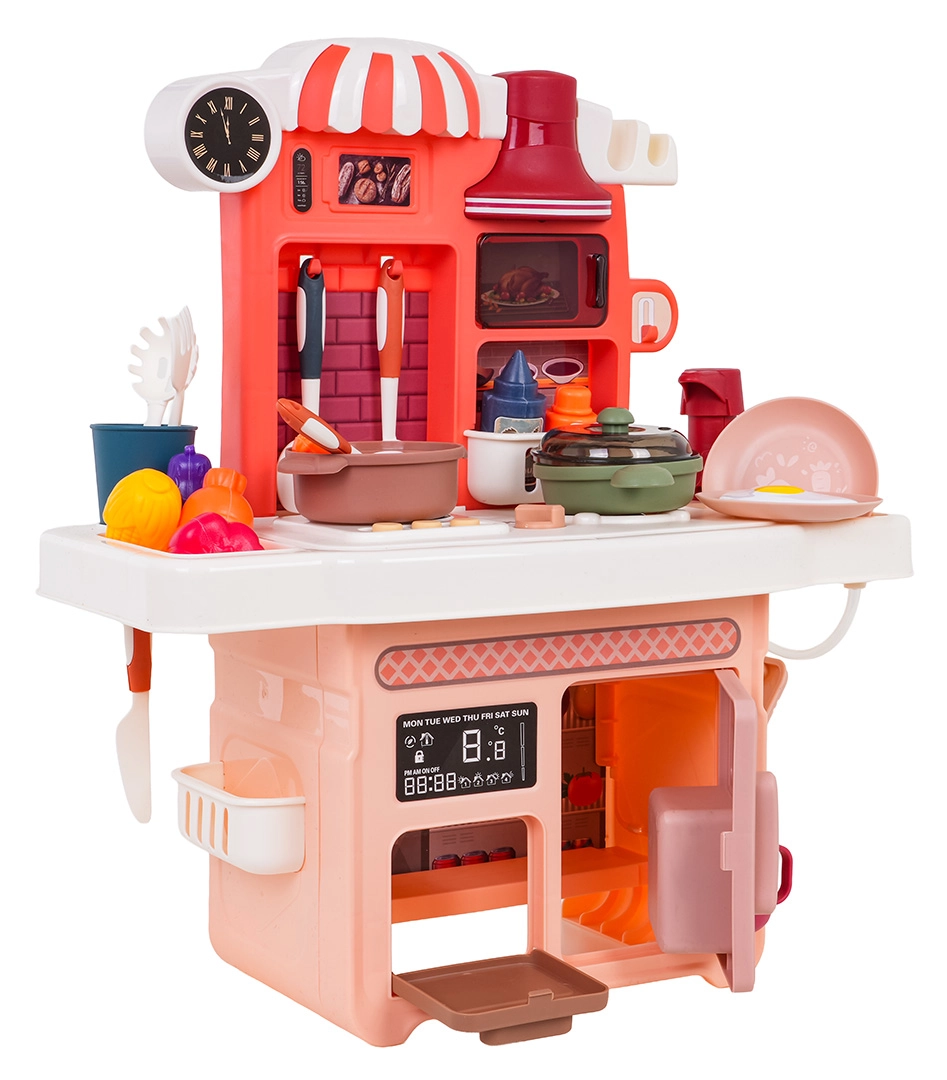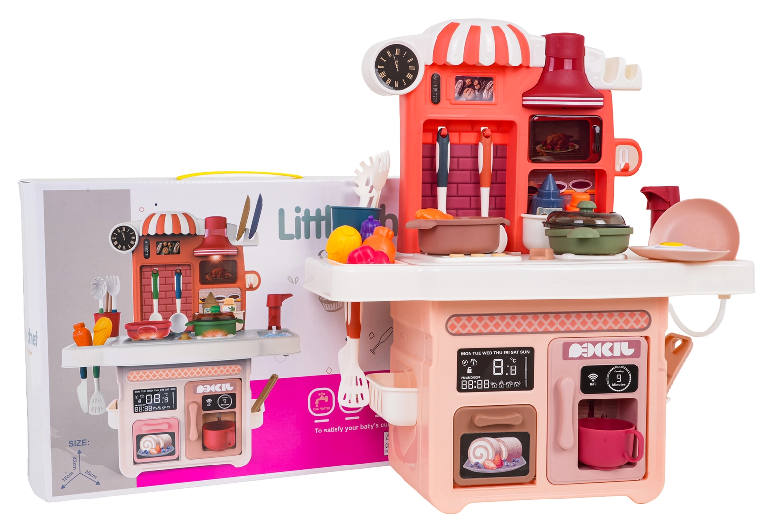L’attraction principale est le robinet fonctionnel – une pompe à piles fait couler l’eau dans l’évier, permettant aux enfants de “laver la vaisselle” comme dans une vraie cuisine. Sont également inclus un four ouvrant, une imitation de machine à café et une hotte aspirante éclairée. Le riche assortiment d’accessoires (casseroles, poêle, ustensiles, assiettes et aliments) élargit les possibilités de jeu.