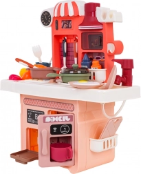 Découvrez la joie de cuisiner avec cette cuisine interactive rose pour enfants dès 3 ans. Elle offre des effets lumineux, des sons réalistes de cuisson et de friture, un robinet fonctionnel avec eau (à pompe) et de nombreux accessoires pour un jeu créatif. Elle comprend aussi des brûleurs rétroéclairés, un four ouvrant, une imitation de machine à café et une hotte éclairée.