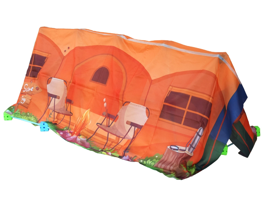 Le set inclut une toile textile colorée au motif camping. Il suffit de la poser sur la structure pour créer un coin de jeu douillet.