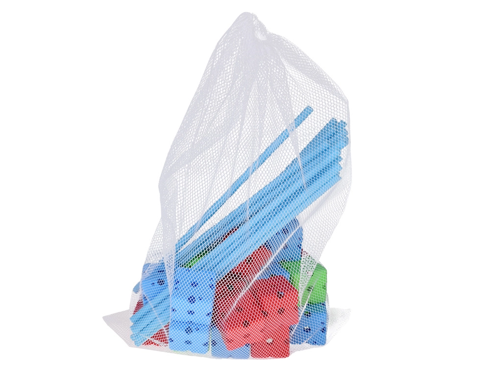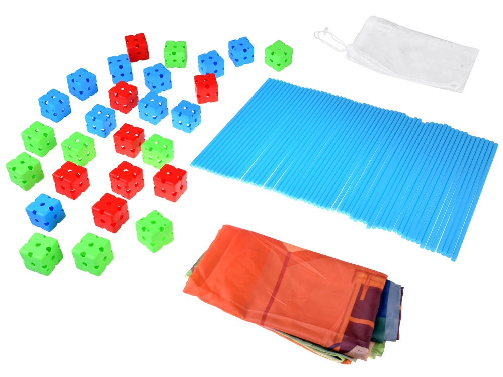 58× tige (env. 38 cm de long, env. 1 cm de diamètre), 29× bloc de connexion (env. 5 × 5 × 5 cm), 1× toile textile imprimée (env. 230 × 155 cm), 1× sachet de rangement en filet