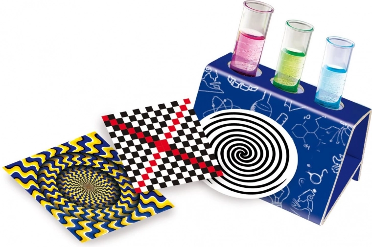 Le coffret comprend des cartes avec illusions d’optique et des expériences simples qui montrent aux enfants comment l’œil perçoit la lumière, les couleurs et les motifs.