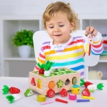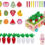 Chariot en bois avec ouvertures de tri ; plateau supérieur coloré pour carottes et vers ; set de formes de fruits ; 8 légumes (4 carottes, 4 « persils/radis ») ; 10 vers en 5 couleurs ; figurine de lapin