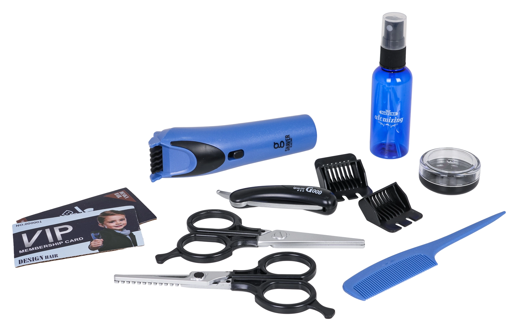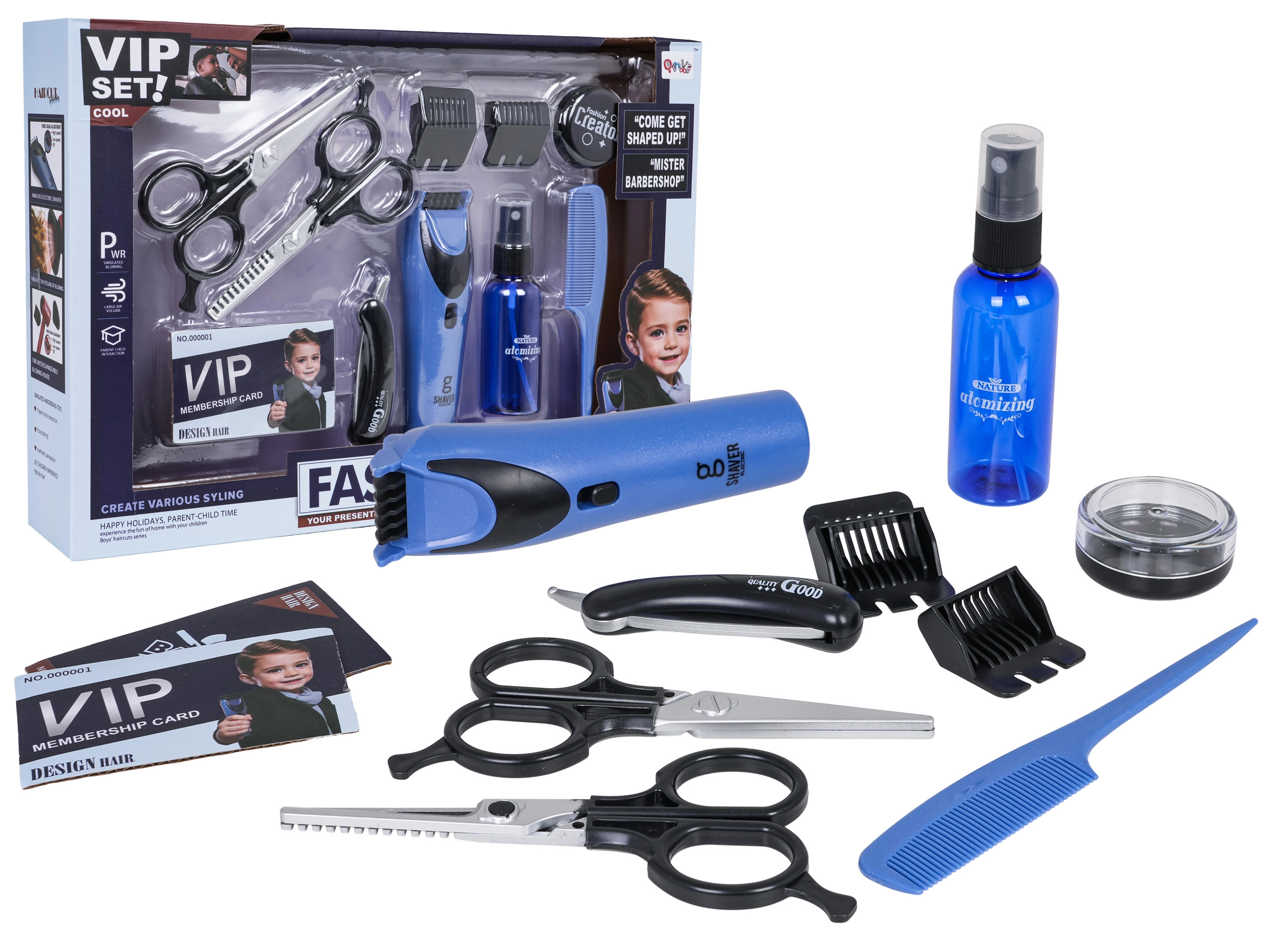 La vedette du set est la tondeuse avec effets sonores et lames mobiles pour un réalisme maximal. Grâce à 11 pièces d’accessoires, les enfants peuvent « servir » un client de A à Z — de la coupe au styling jusqu’au soin de la barbe.