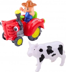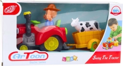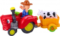Ce tracteur coloré et sûr offre aux enfants un jeu à la fois amusant et éducatif. Une fois activé, le tracteur se met en marche en avant et en arrière, des lumières s’allument dans la cheminée et les « yeux », et des mélodies joyeuses et un salut retentissent. Les enfants peuvent transporter la petite vache sur la remorque et inventer leurs propres histoires de fermiers.